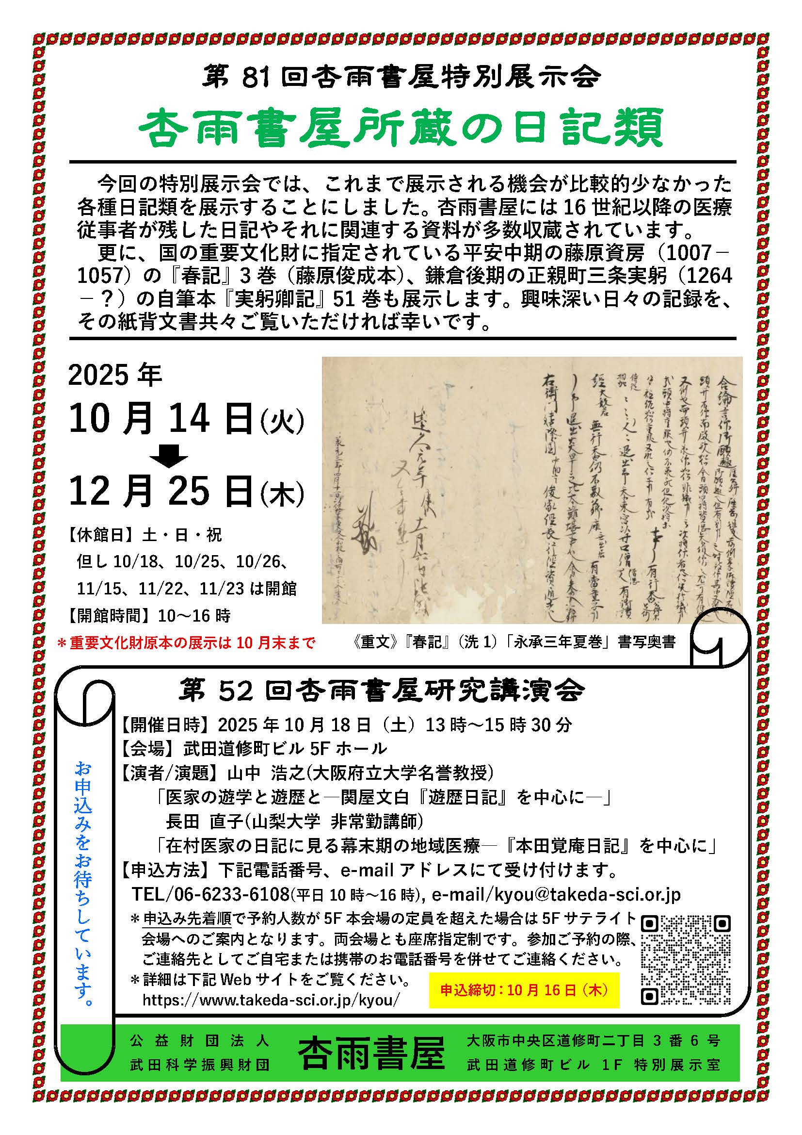 申込方法:電話/06-6233-6108(平日10:00~16:00)、E-mail:kyou@takeda-sci.or.jp